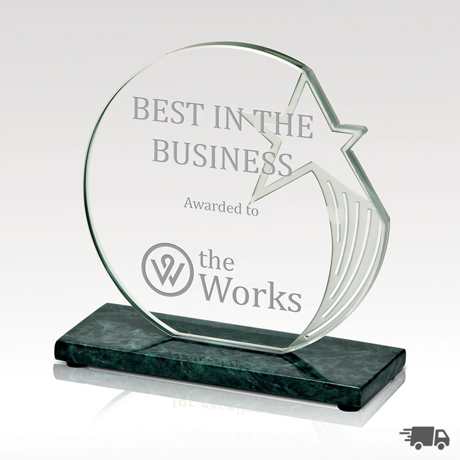 Exceptional deep green marble forms the base of the glass disc with an skillfully carved shooting star. For those rising to the top of your organization, the Sculpted Star is the natural choice for recognition.