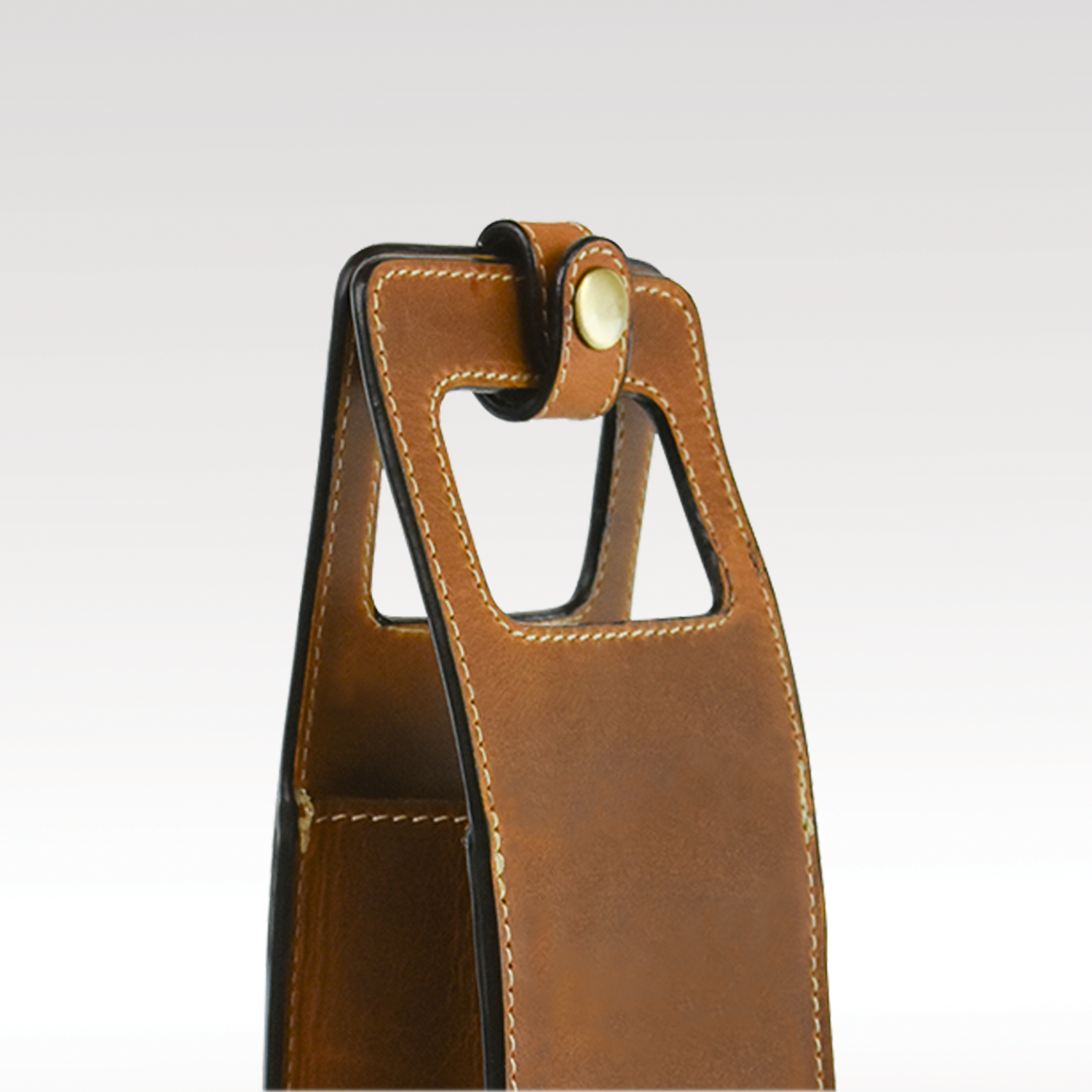 Crafted from premium full-grain European cow leather, this wine caddy brings together fine craftsmanship and timeless elegance. Its sleek cylindrical design is hand-stitched by skilled artisans and showcases meticulous detail and durability. It perfectly cradles a standard wine bottle, ideal for transporting a favorite vintage.  It also makes for an unforgettable gift that is useful for both special occasion, everyday use, and special event. With every use, the leather develops a rich patina that tells its own story—deepening its character and beauty over time.