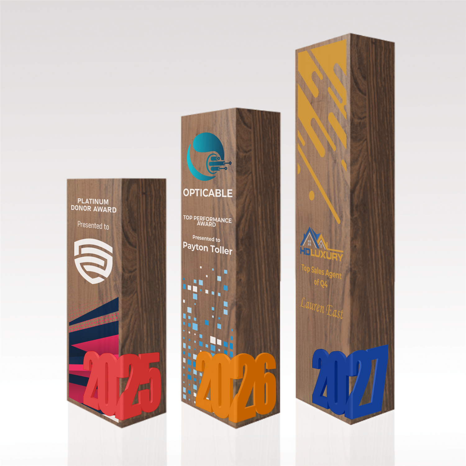Shine bright with attractive, energetic and engaging accents! Style your award with a Star, Number, Year, Letter or Metal Band. Upgrade to a Chevron or Flag Accent, for an upcharge.