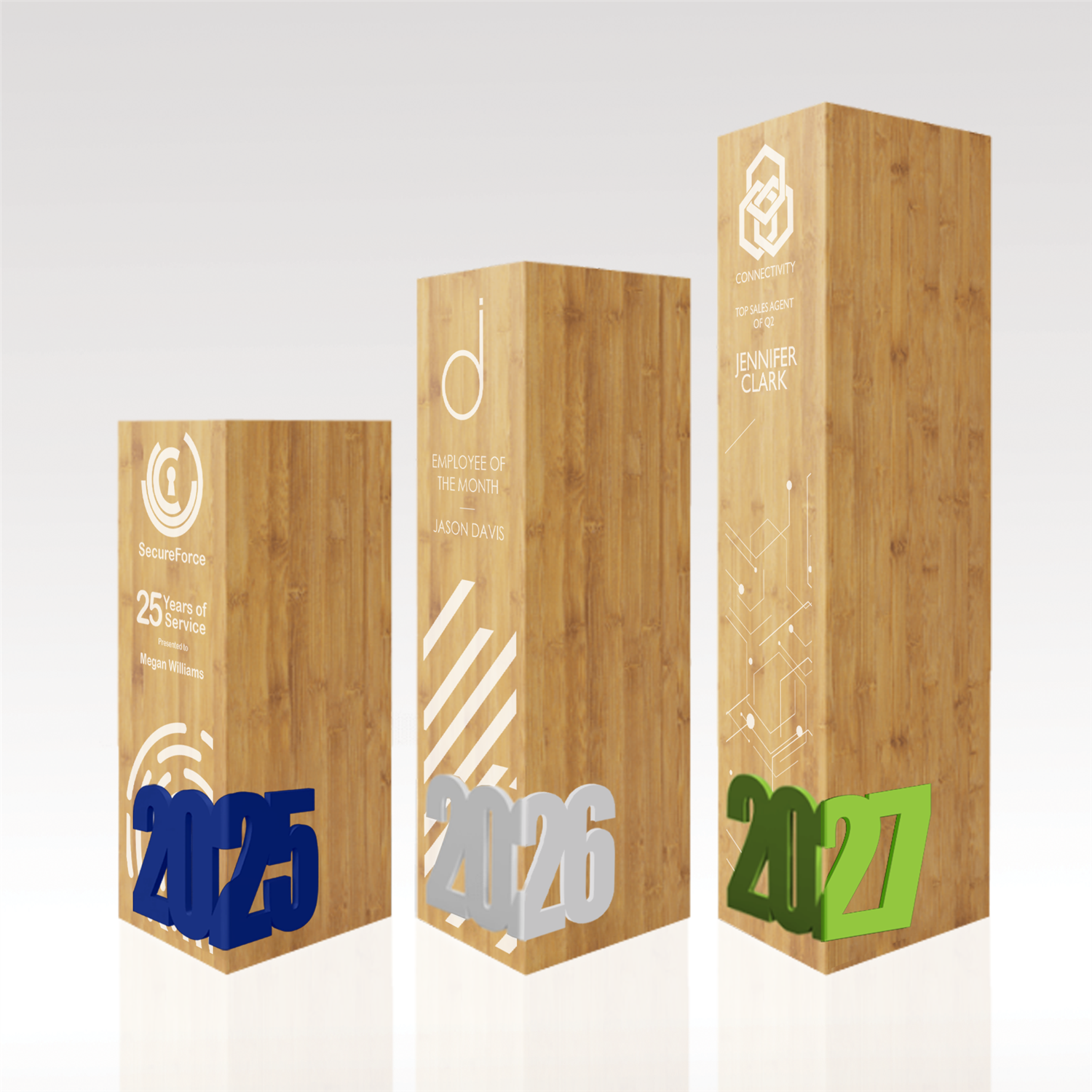 Shine bright with attractive, energetic and engaging accents! Style your award with a Star, Number, Year, Letter, Face Plate or Aged Metal Band. Upgrade to a Chevron or Flag Accent, for an upcharge.