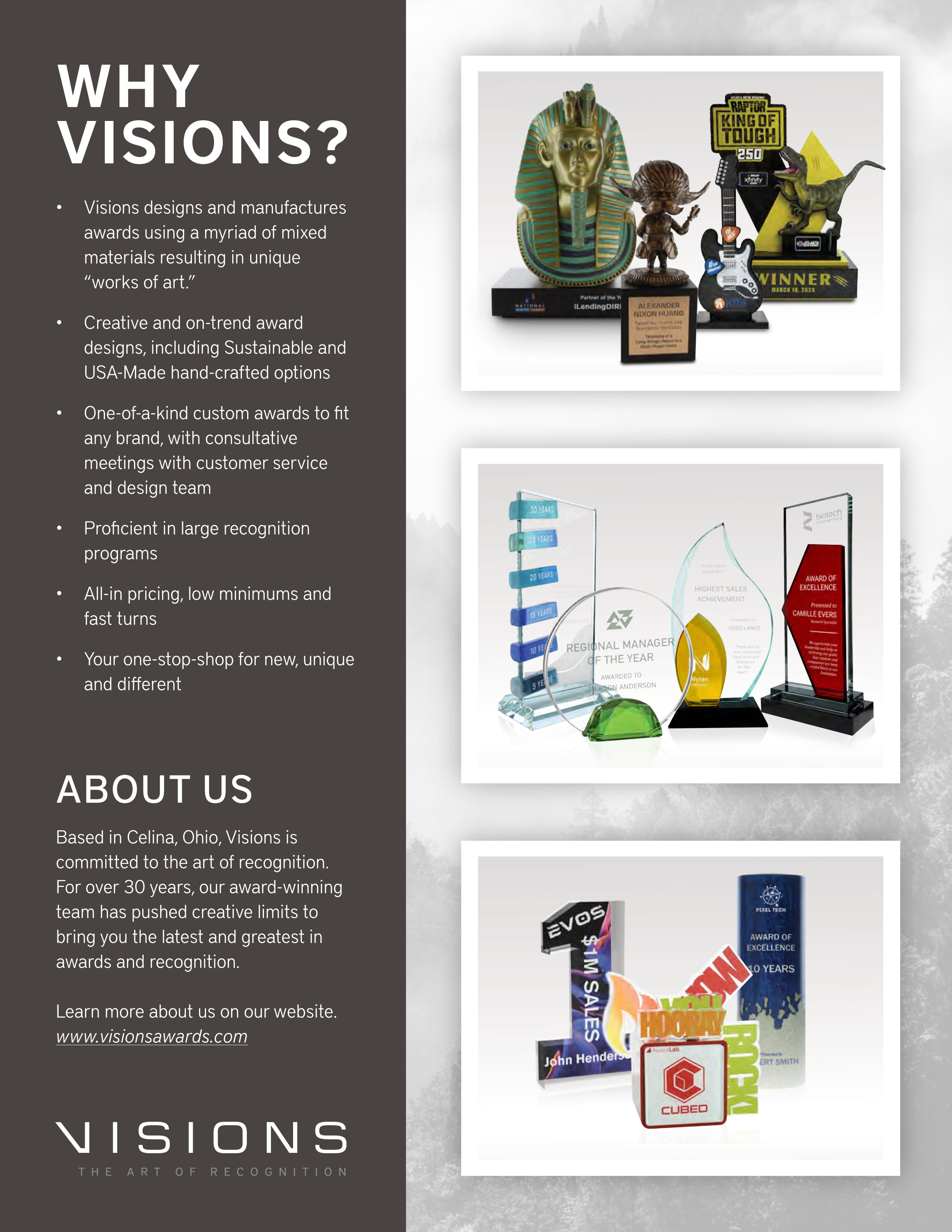 Visions Awards creates custom, branded sales tools designed to educate your buyer, and help you confidently sell recognition programs whether you’re introducing recognition for the first time or expanding an existing program.