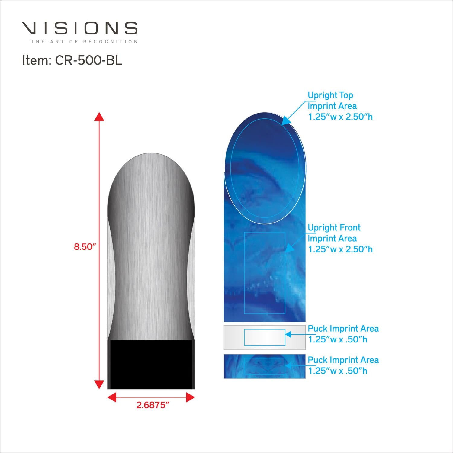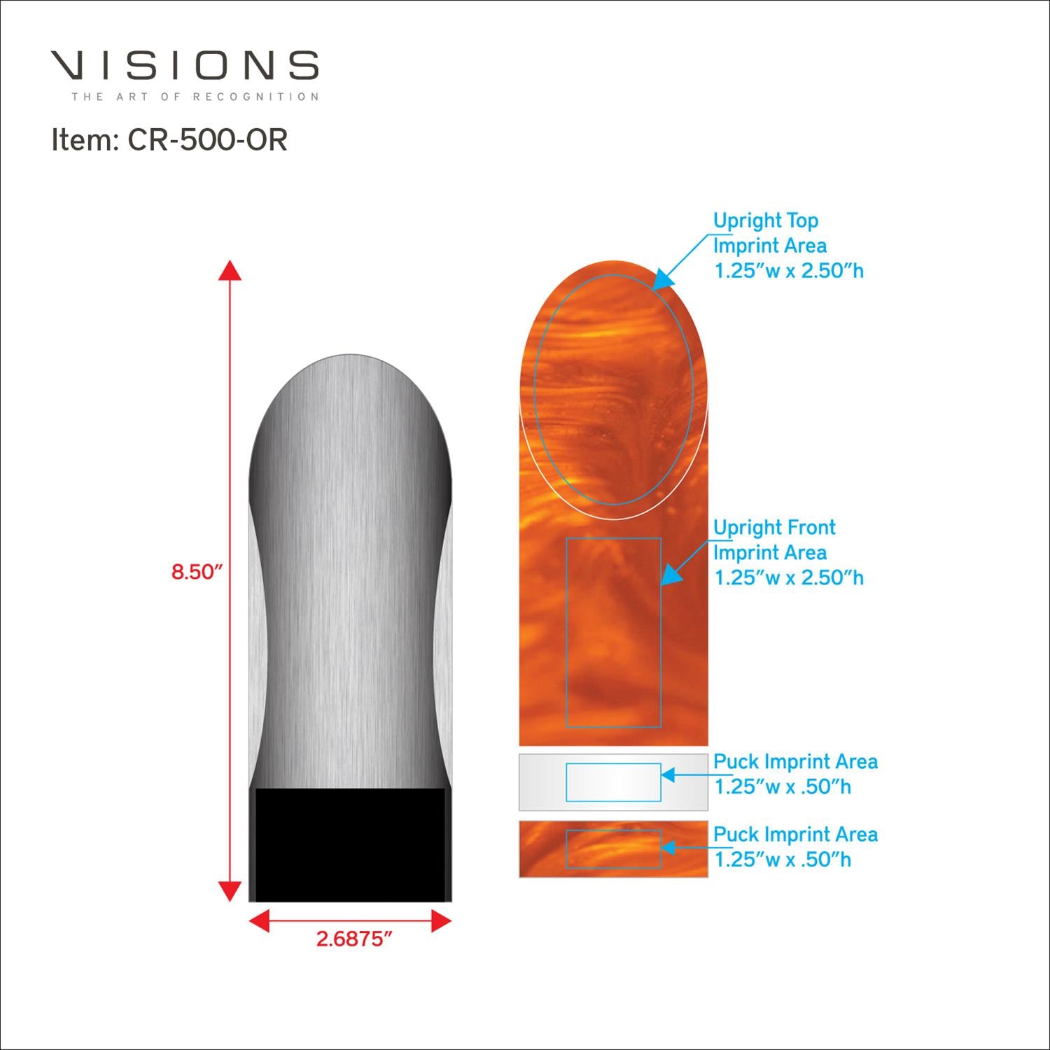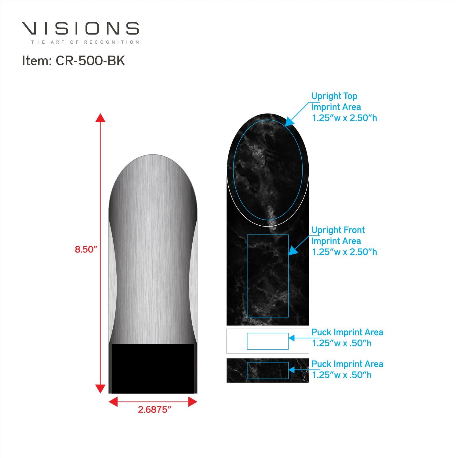 Imprint Area: UPRIGHT TOP: 1.25" W x 2.50" H, UPRIGHT FRONT: 1.25" W x 2.50" H