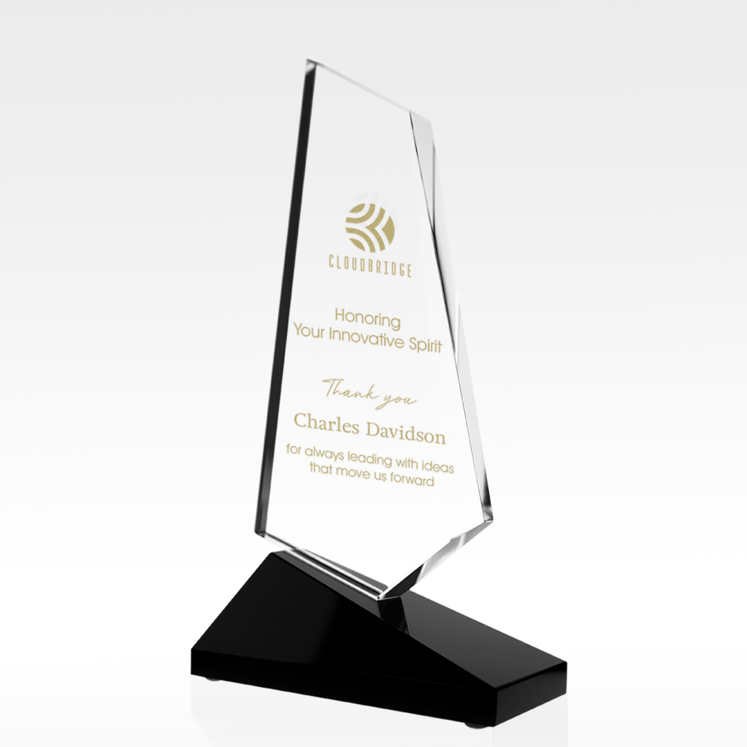 Honor employees with the elegant and lustrous Cryptic award. This optical crystal award provides ample room for a recognition message and personalization and features an alluring beveled accent, paired with a slanted and sleek black optical crystal base.