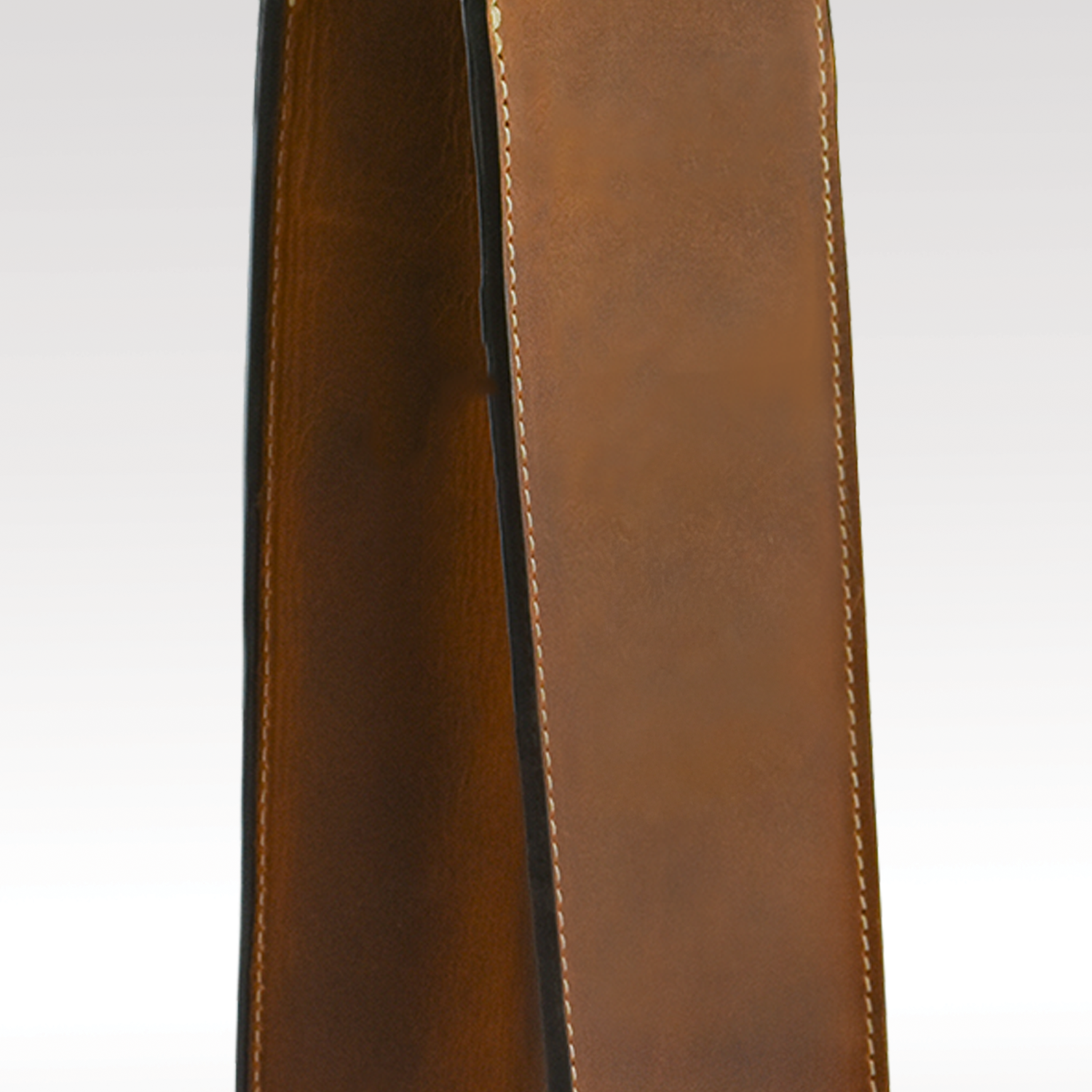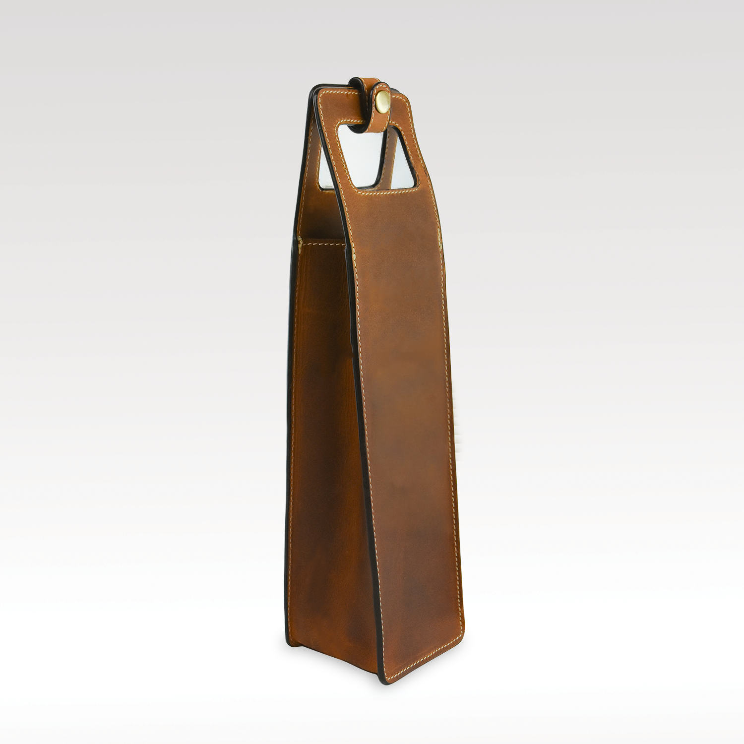 Crafted from premium full-grain European cow leather, this wine caddy brings together fine craftsmanship and timeless elegance. Its sleek cylindrical design is hand-stitched by skilled artisans and showcases meticulous detail and durability. It perfectly cradles a standard wine bottle, ideal for transporting a favorite vintage.  It also makes for an unforgettable gift that is useful for both special occasion, everyday use, and special event. With every use, the leather develops a rich patina that tells its own story—deepening its character and beauty over time.