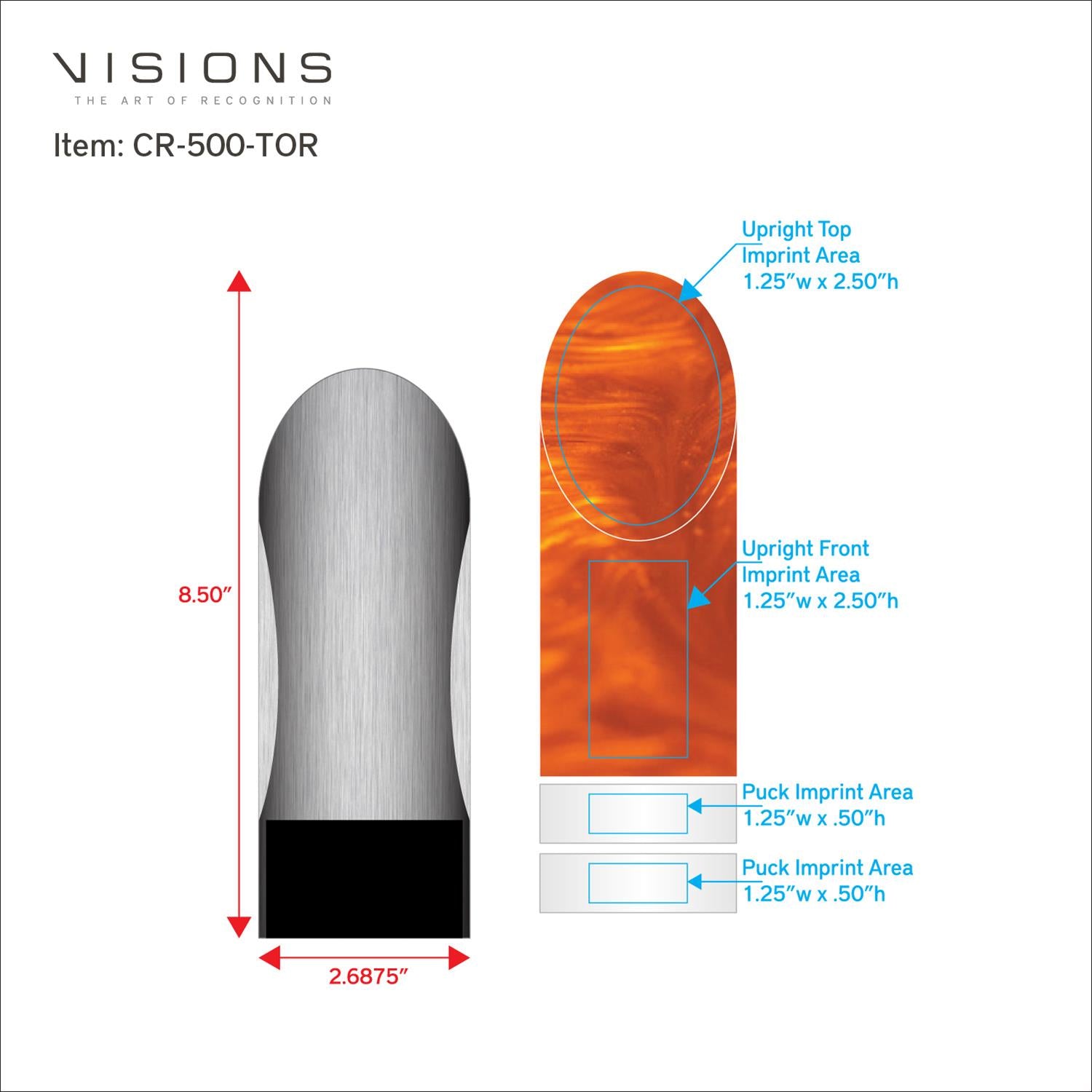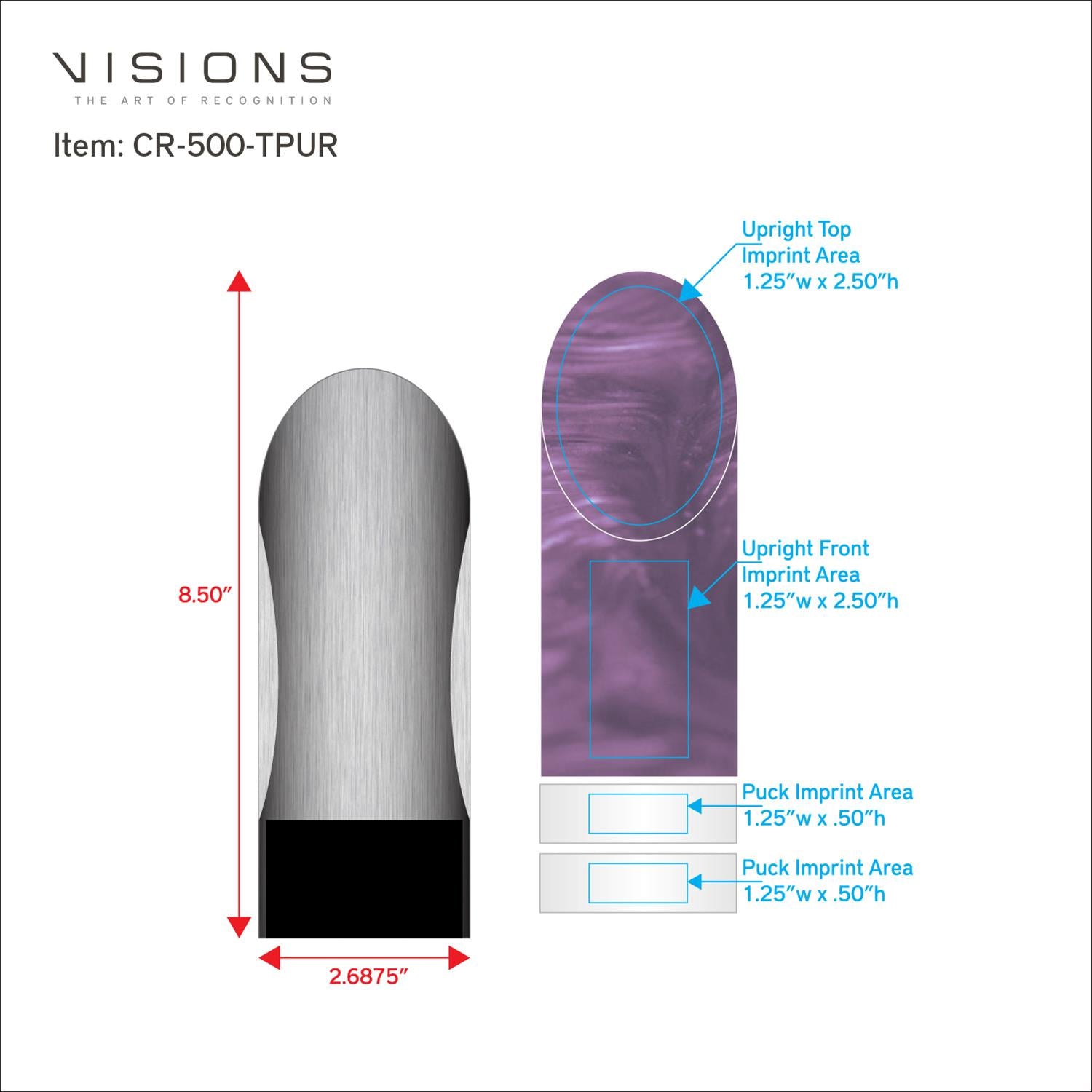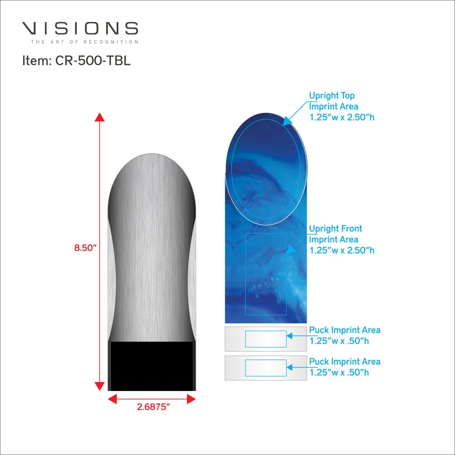 The Metropolitan Collection gives new height to achievements while allowing one to easily recognize future accomplishments. Your choice of Swirled resin or limited edition Bubbly Transparent resin cylinders. Price for the Swirled resin option includes the resin cylinder, the metal or crystal upright, and two pucks (one personalized resin puck and one blank optical crystal puck “placeholder” for future achievements).